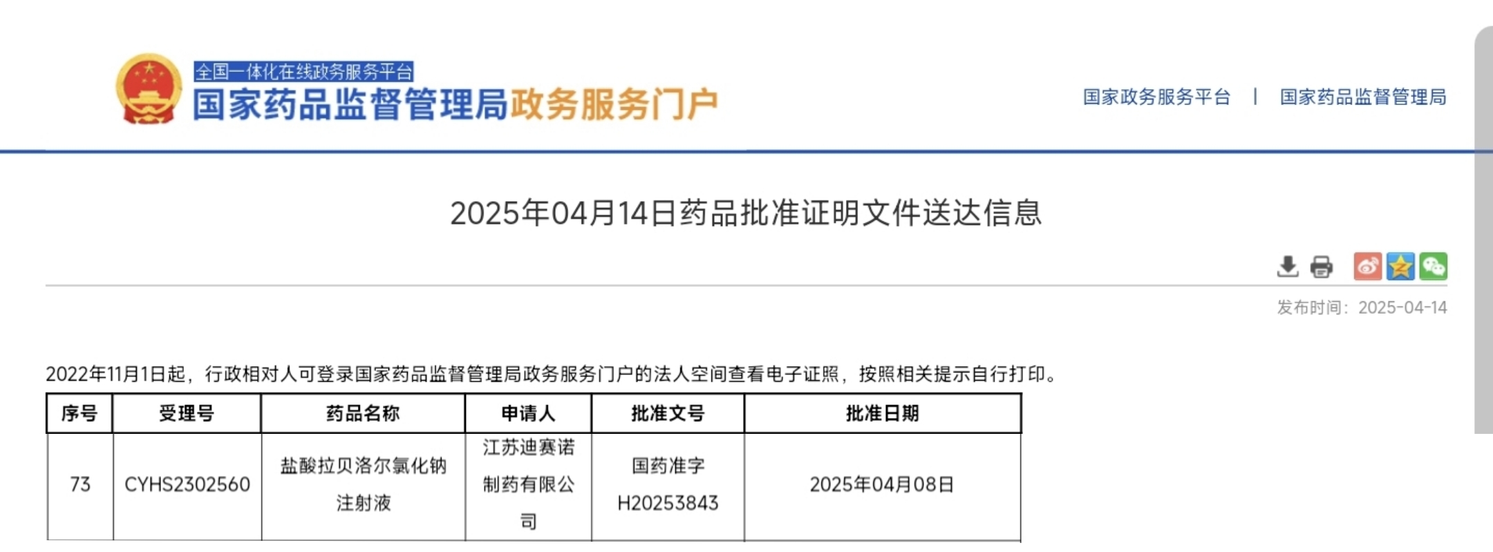 2025年4月8日,冠亚网_冠亚(中国)的盐酸拉贝洛尔氯化钠注射液(国药准字H20253843)成功获得国家药品监督管理局(NMPA)批准上市,该产品是公司的化药3类仿制药,是该品种药物的国内首仿。这一成果标志着公司在心血管领域的产品布局迈上新台阶,也为广大患者提供了更优质的用药选择。